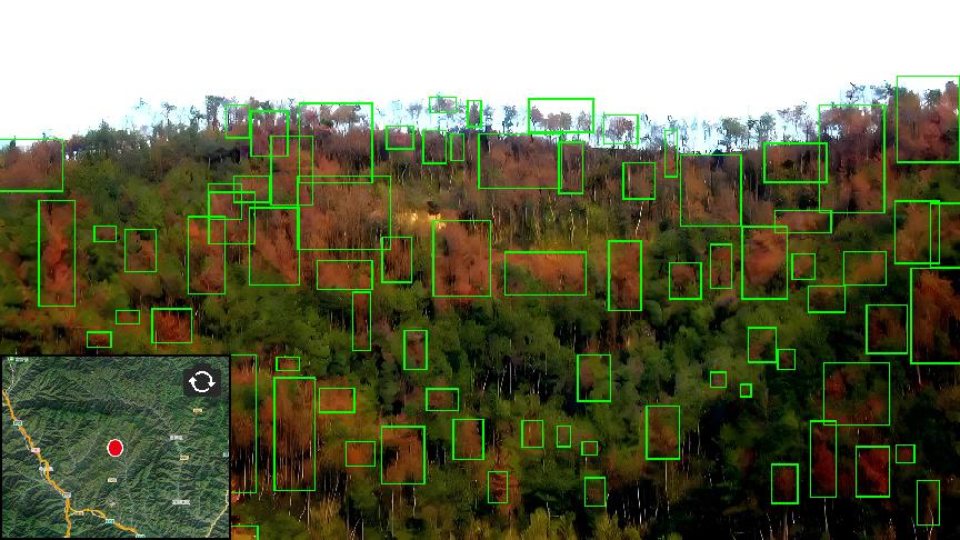 智能識別施業(yè)區(qū)因病蟲害造成的樹木顏色及生長狀態(tài)異常問題。定期定時進(jìn)行施業(yè)區(qū)日常巡檢,用無人機(jī)替代守林員的日常巡視工作,提高工作效率的同時又減少了巡檢人員的意外風(fēng)險。支持熱紅外活體識別,識別山林中的人員及動物。巡檢時自啟動相關(guān)煙火識別算法,利用熱紅外成像信息,識別異常高溫地塊。及時排查避免發(fā)生災(zāi)情。